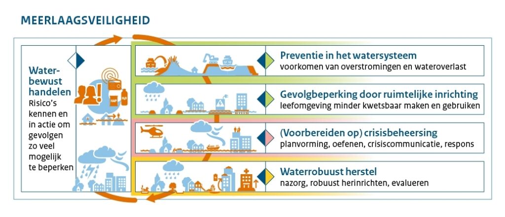 Vanwege de toenemende kans op extreme neerslag ontwikkelt IenW in de komende jaren een Nationale Aanpak Wateroverlast. Deze bestaat uit twee onderdelen: het in kaart brengen van de gevolgen, en het vergroten van de weerbaarheid en veerkracht bij verschillende situaties van wateroverlast, waaronder ook kortdurende piekneerslag. Voor een groot deel zijn de bijbehorende acties al in gang gezet, in lijn met de afspraken die zijn gemaakt door de Beleidstafel Wateroverlast en Hoogwater. Bij de uitwerking van de Nationale Aanpak Wateroverlast wordt het principe van meerlaagsveiligheid gevolgd.