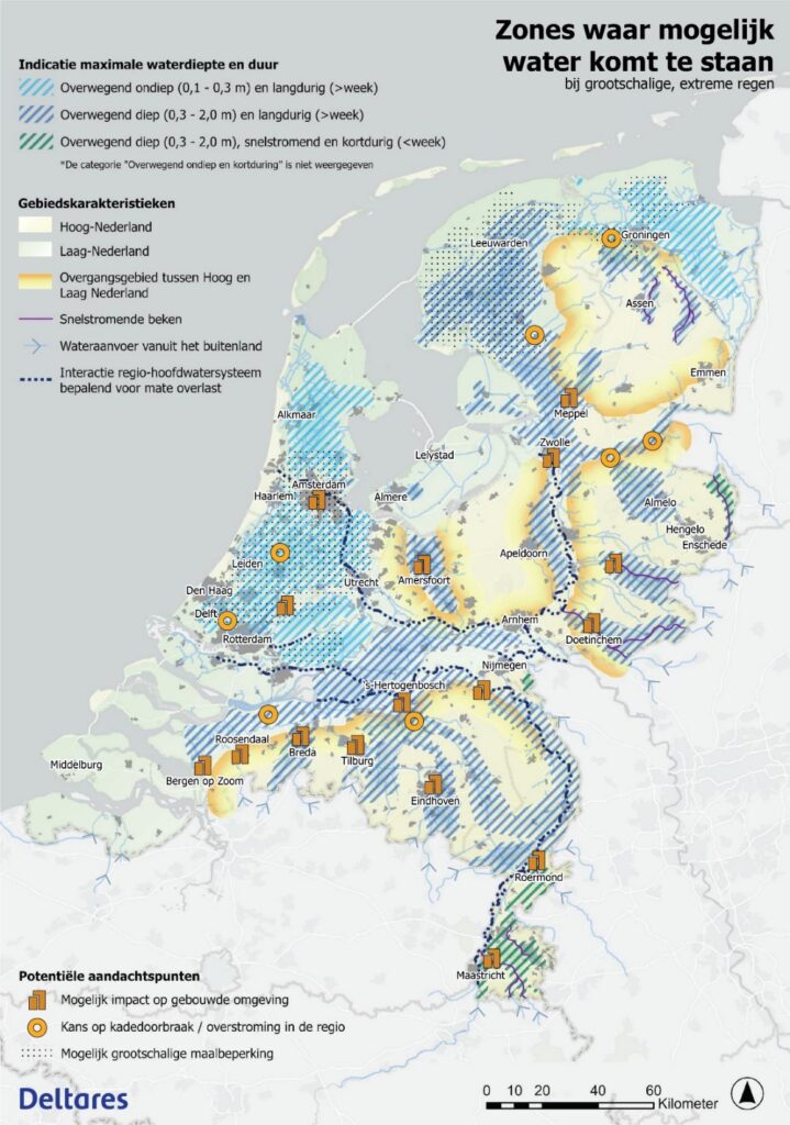 – Bij grootschalige extreme regen kunnen grote waterdieptes ontstaan (tot lokaal wel 1 à 2 meter diep). Met name in de hellende gebieden, de gebieden langs beken en in de overgangsgebieden van hoog naar laag Nederland.