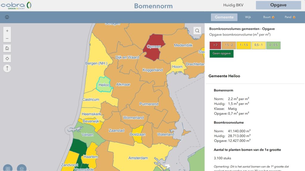 Met welke maar bomen je begint, hangt dus af welke doelen een gemeente stelt. Realiseer je wel als een gemeente zegt ‘duizend of tienduizend bomen erbij’, dat dit ondergrondse ruimte kost. ‘Voor een boom die groot en oud moet worden, gaat het om ongeveer 40 kuub doorwortelbare ruimte, liefst zonder kabels en leidingen. En volg ze in de tijd.’ Dat laatste kan interactief. Verhagen toont een kaart met geplante en bestaande bomen in een wijk. Je ziet hoe de groene stippen groter worden en de ecosysteemdiensten toenemen van 2025 tot 2030 of 2040. ‘Als je goede plantplekken hebt gekozen, gaat het vaak vanzelf.’