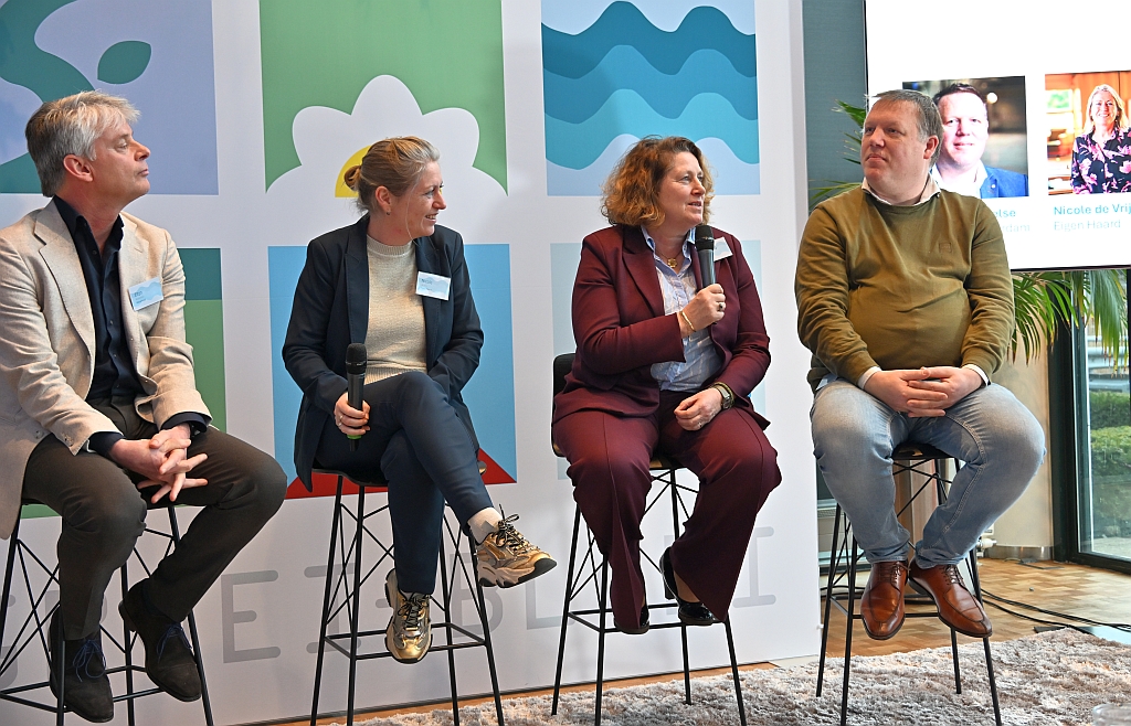 De middag wordt afgerond met een panelgesprek over de vraag hoe ontwikkelaars, gemeenten en woningcorporaties samen tot duurzame oplossingen voor waterberging en waterbesparing kunnen komen. Yvonne van Mierlo introduceert Nicole de Vrij (Directeur Ontwikkeling & Zakelijk Beheer bij Eigen Haard), Mattijs Rommelse (Bouwregisseur Gemeente Rotterdam), Ingeborg de Jong (Directeur Timpaan) en Eltjo Bouwman (Directeur Ontwikkeling Blauwhoed).