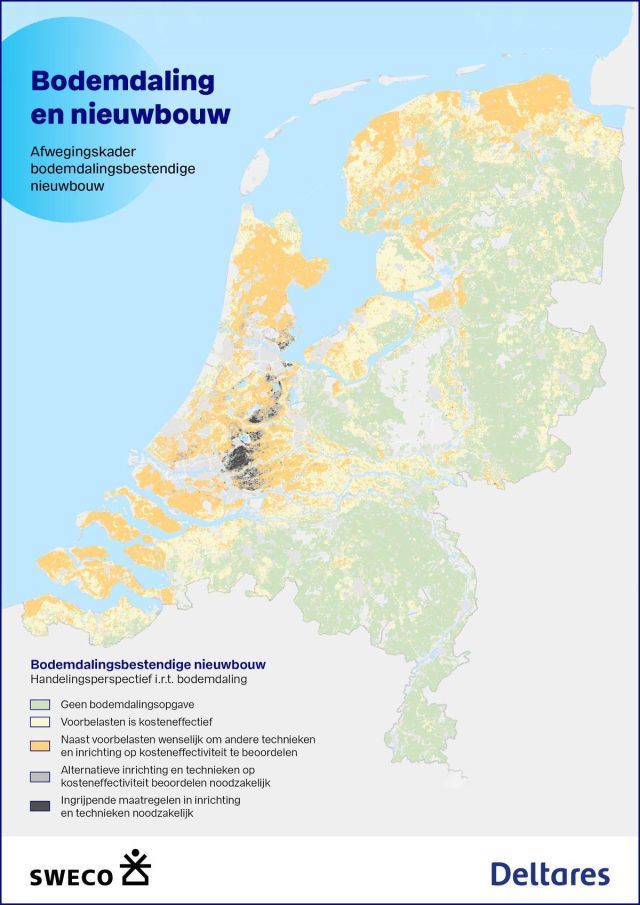 Een aanzienlijk deel van de Nederlandse woningbouwopgave ligt in gebieden die gevoelig zijn voor bodemdaling. Dat roept de vraag op hoe je daar verantwoord en betaalbaar kunt bouwen. De nieuwe landelijke bodemdalingskaarten van Deltares en Sweco laten zien waar traditionele bouwmethoden volstaan, en waar alternatieve technieken nodig zijn. Het ministerie van IenW bekijkt inmiddels hoe de bevindingen kunnen worden meegenomen in het ‘Ruimtelijk afwegingskader klimaatadaptieve gebouwde omgeving’.