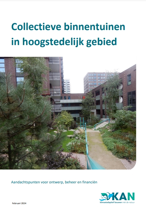 | Factsheet collectieve binnentuinen in hoogstedelijk gebied Collectieve binnentuinen in hoogstedelijk gebied (KAN Platform, pdf, februari 2024) In hoogstedelijke woonprojecten zie je steeds vaker collectieve binnentuinen. Waar moet je op letten om daar een succes van te maken? Hoe beheer je de groene inrichting en hoe regel je de toegankelijkheid? Wat kost het en wat levert het op? |  |