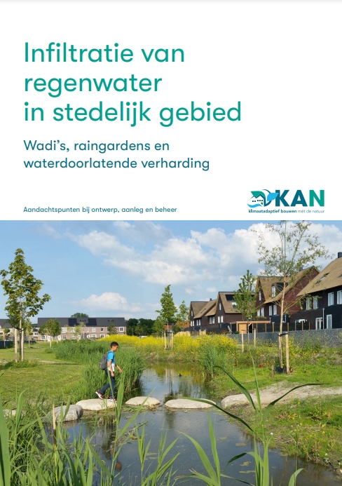| Infiltratie van regenwater in stedelijk gebied Infiltratie van regenwater in stedelijk gebied – Wadi’s, raingardens en waterdoorlatende verharding: aandachtspunten bij ontwerp, aanleg en beheer (KAN Platform, pdf, februari 2024) In binnen en buitenland zijn er al duizenden voorbeelden van geslaagde projecten op basis van bovengrondse afvoer met infiltratie van regenwater. Er is dus veel praktische kennis beschikbaar. In deze KAN-publicatie bespreken we de meest actuele inzichten. |  |